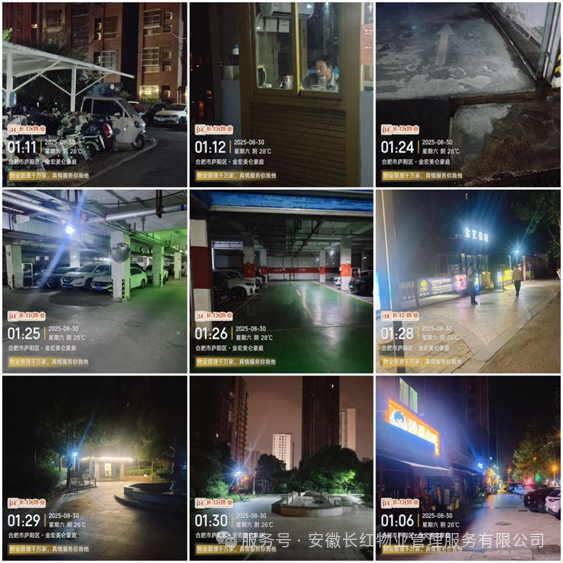 他们先是绕着小区外围巡查,接着走进单元楼,从单元楼门禁到消防设备,从停车场监控到绿化带照明,甚至蹲下来看了看地下车库的排水口—“汛期刚过,这些细节不能马虎”;凌晨的小区很安静,他们用脚步丈量责任,用行动践行承诺,成为小区里最默默的“守夜人”。