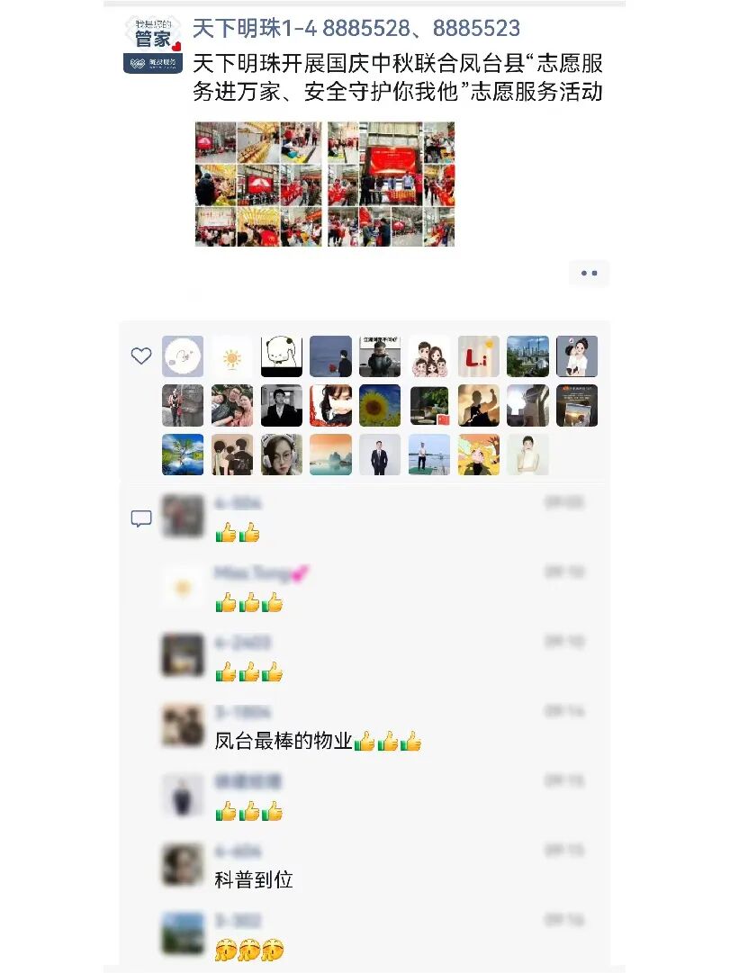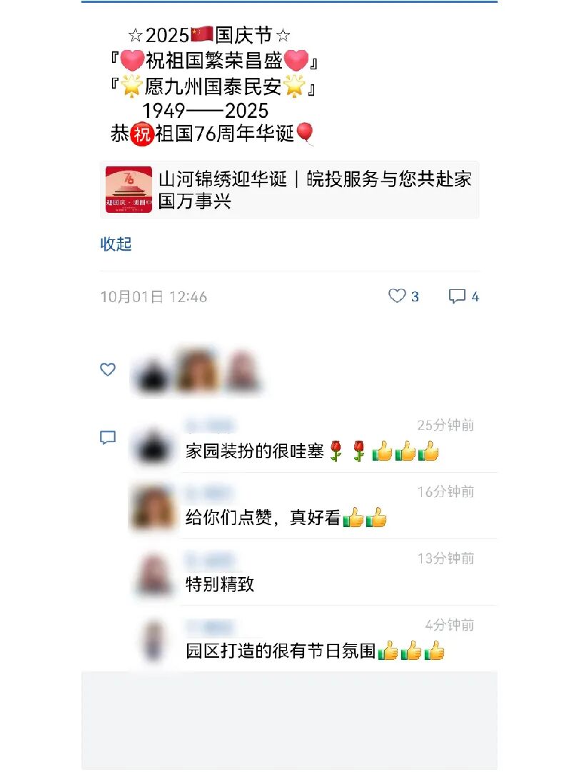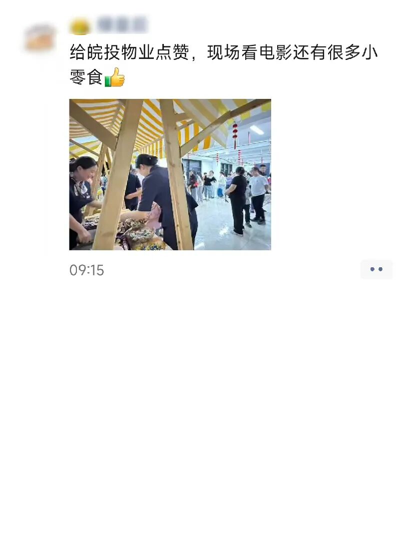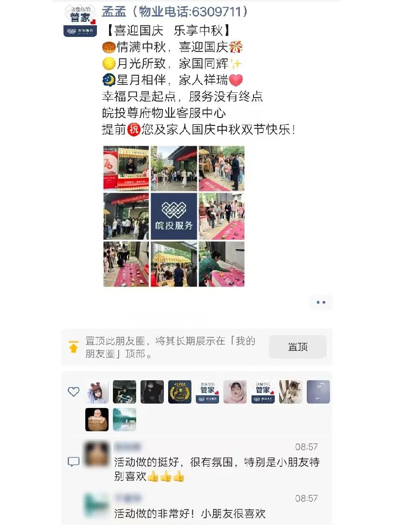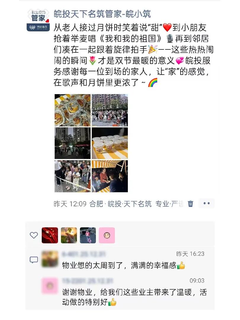 双节假期暖意浓,皖投服务用心相伴!无论是节日活动的精心筹备,还是日常服务的贴心周到,都被业主看在眼里、记在心里 —— 许多业主特意在朋友圈分享体验,为物业管家的臻心服务点赞。我们始终坚信,这份朴素的心意,会随每一份认可抵达更远,让温暖常伴家园。