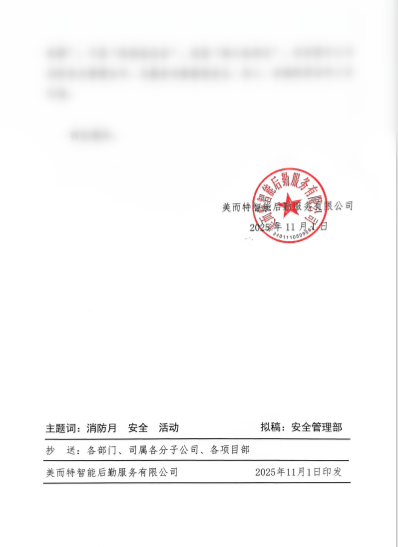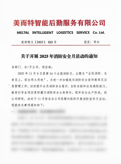今年11月9日是第34个全国消防日,主题为“全民消防、生命至上——安全用火用电”。美而特智能后勤服务有限公司积极响应号召,在全国各项目点构建“总部统筹、项目联动、多方协同”的消防安全工作体系,以实际行动筑牢安全防线。