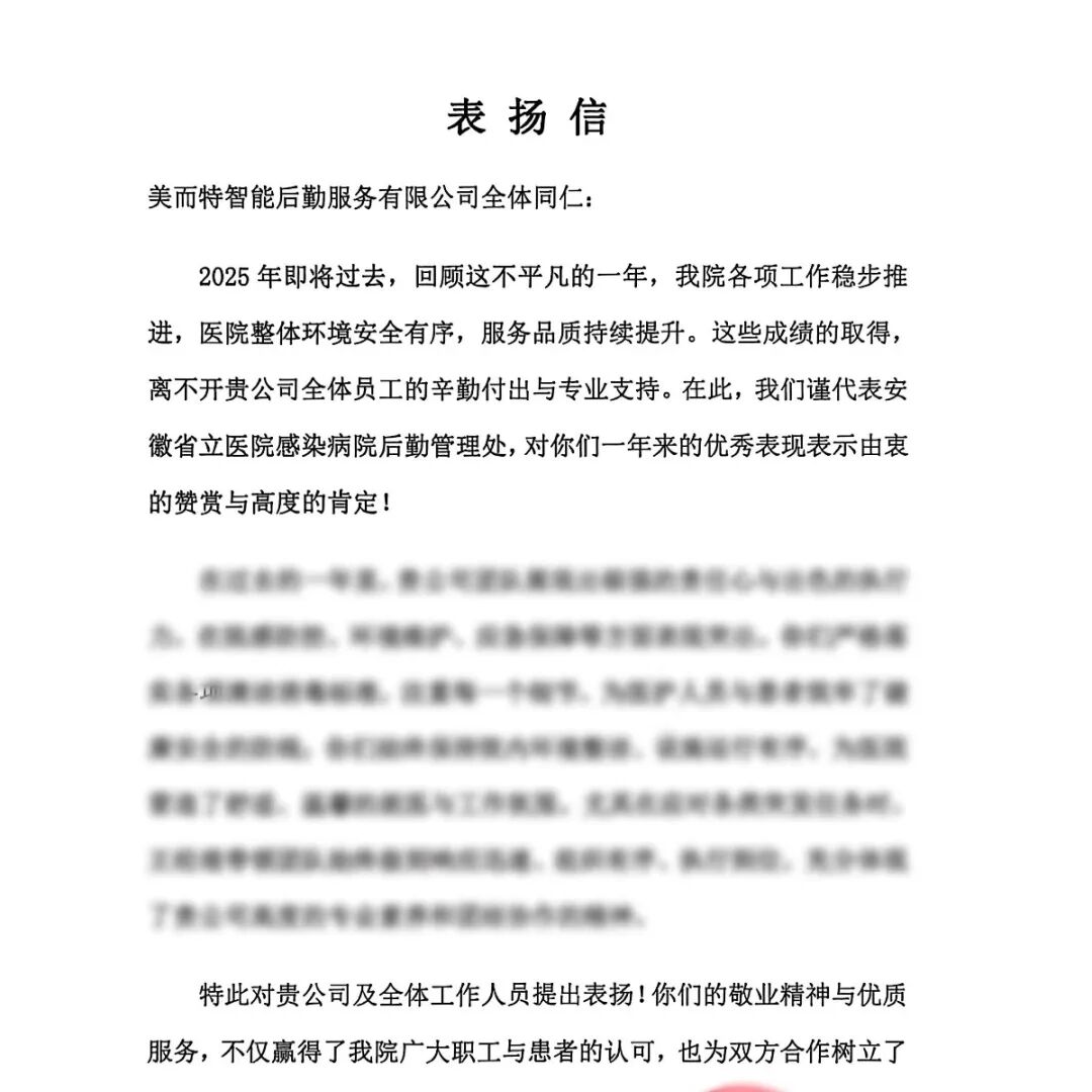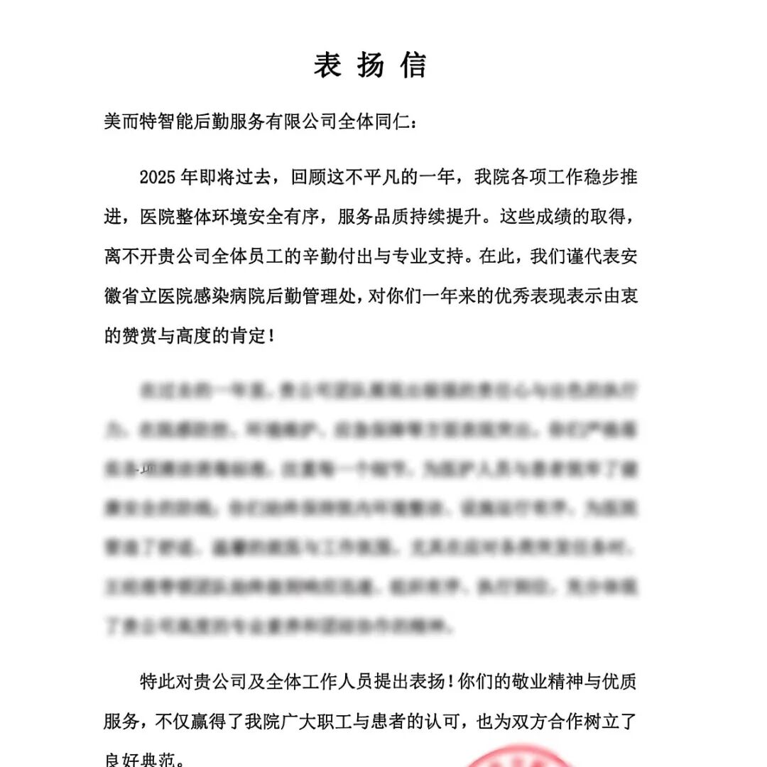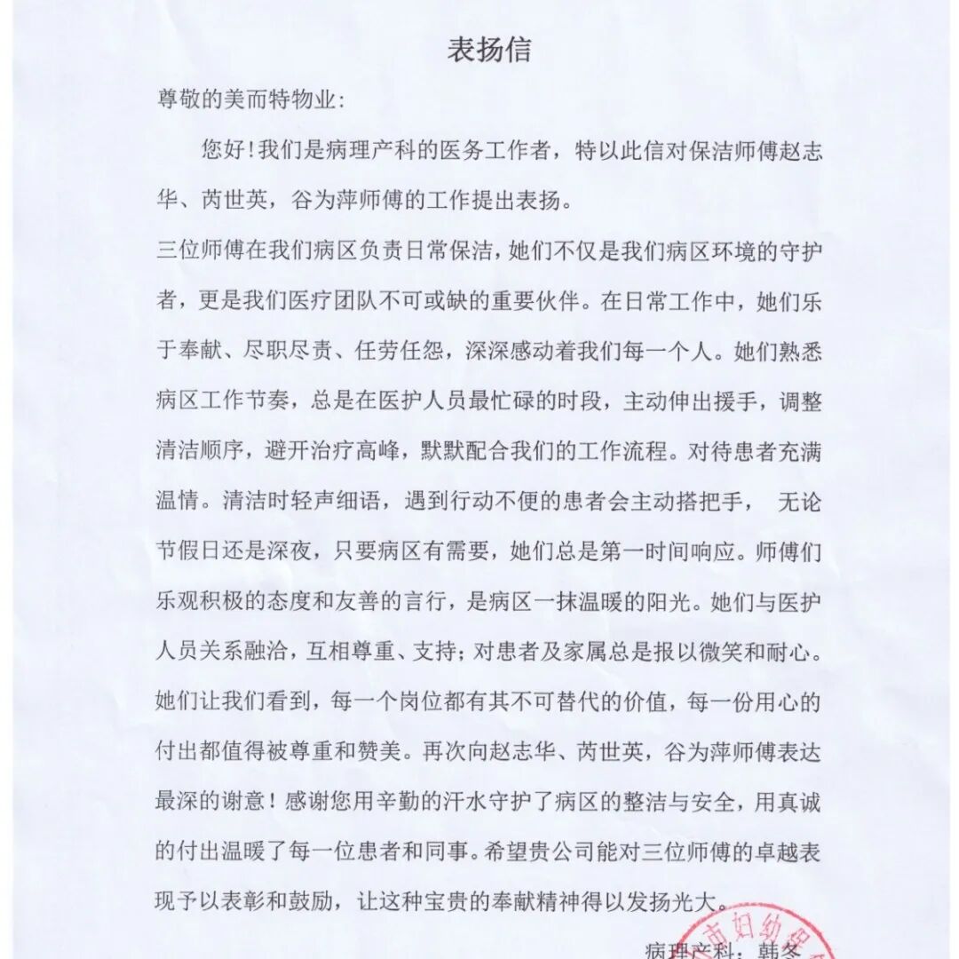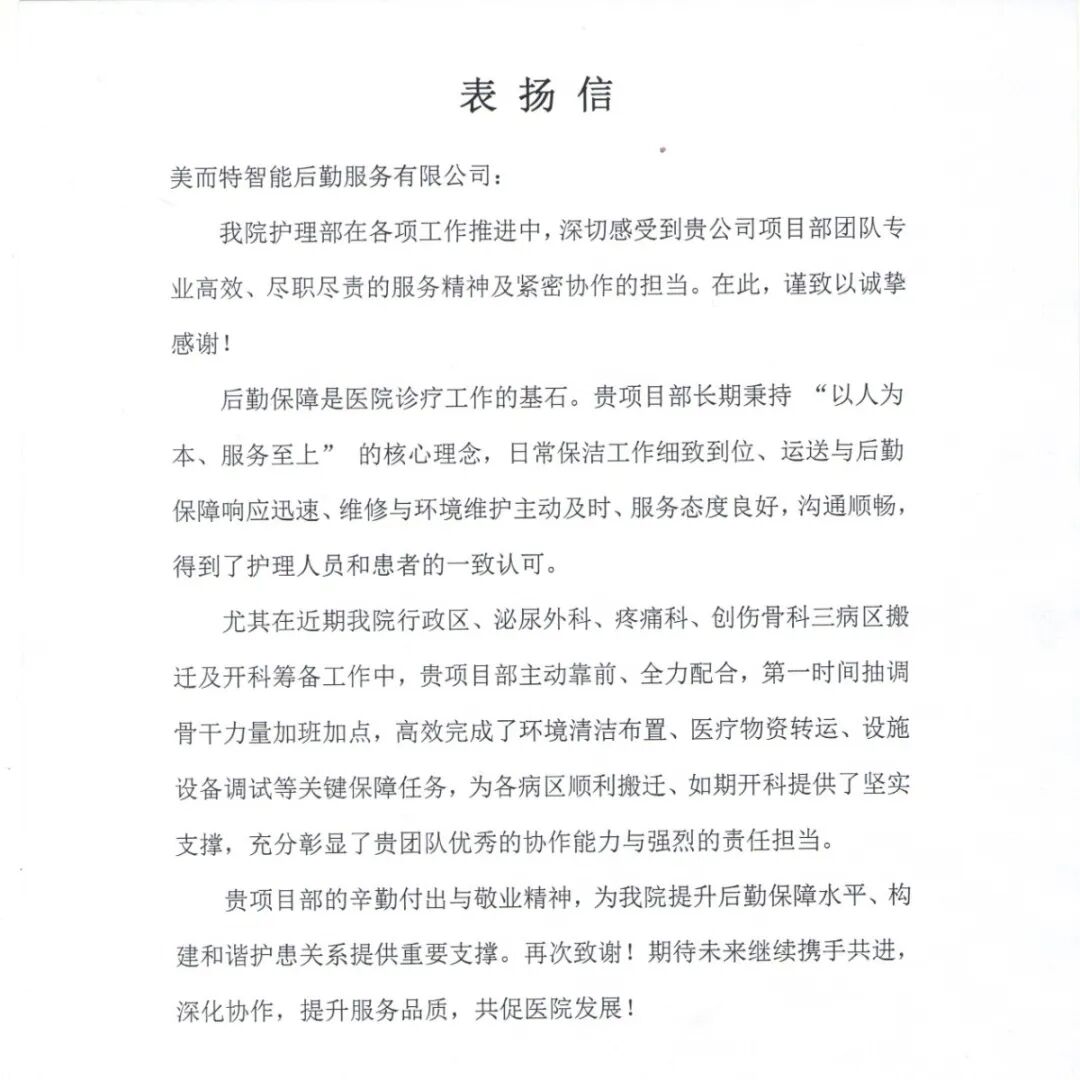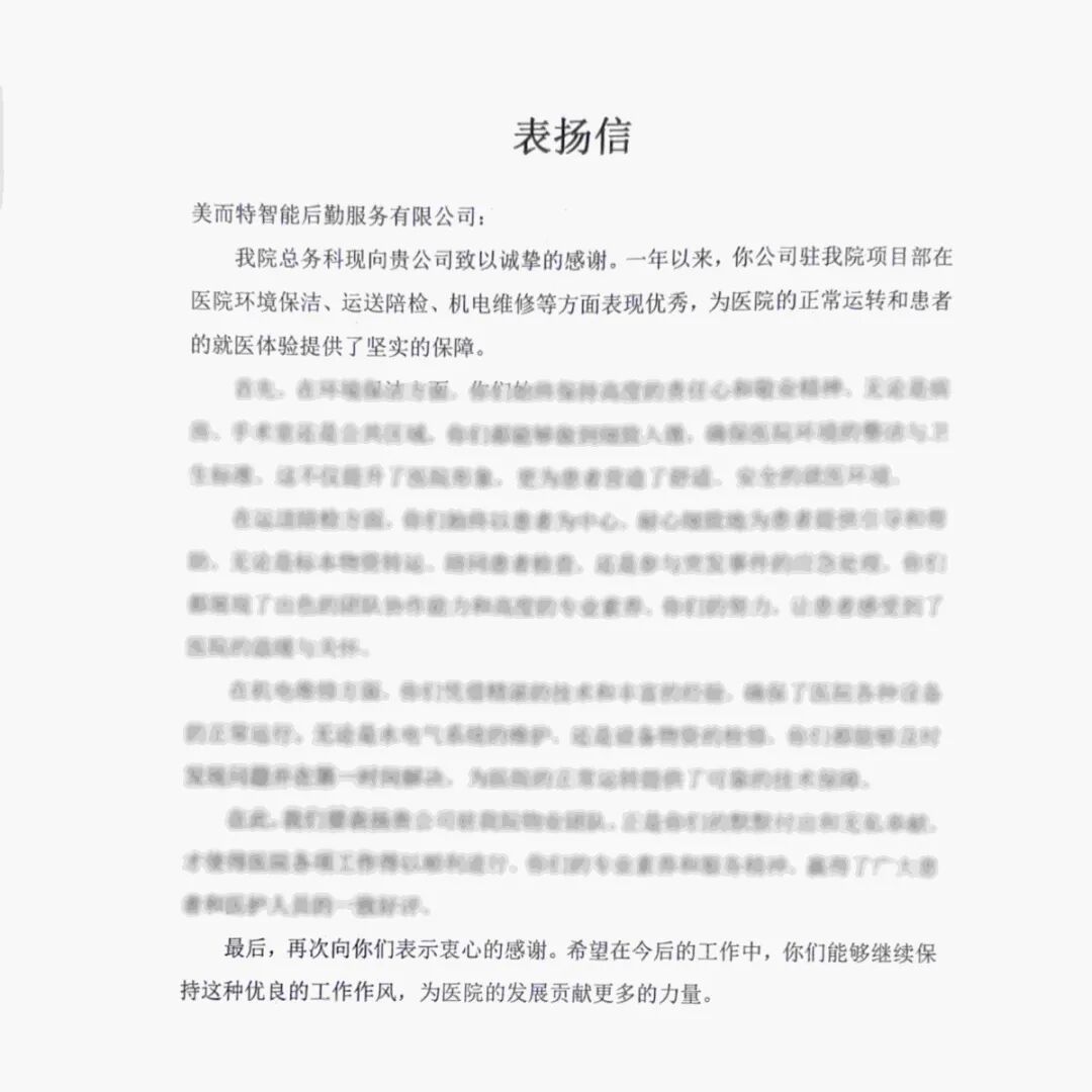 某医院后勤部:一年以来,公司驻我院项目部,在环境保洁、运送陪检、机电维修等方面,为医院的正常运转和患者就医体验提供了坚实保障。