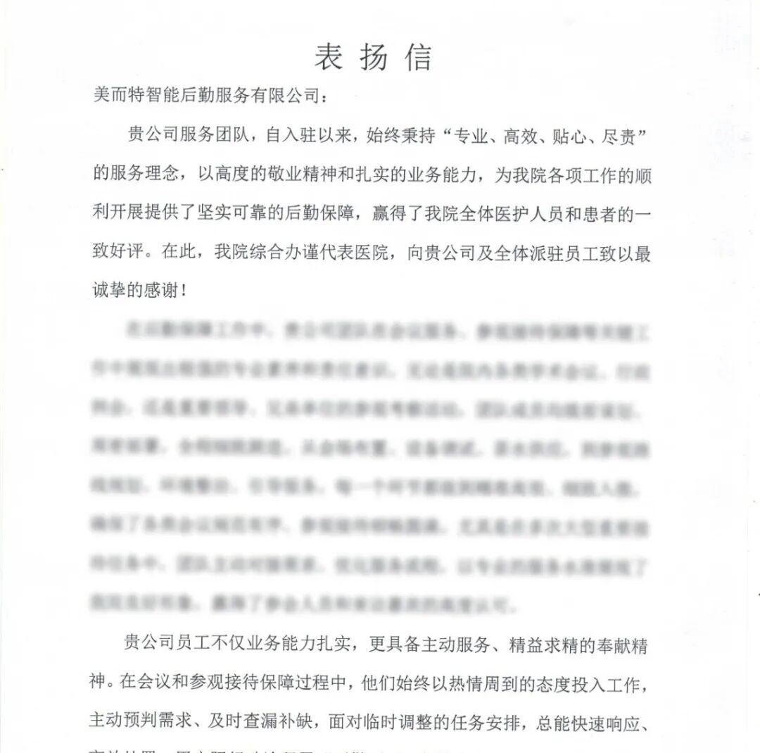 某医院综合办:自入驻以来,始终秉持"专业、高效、贴心、尽责"的服务理念,以高度的敬业精神和扎实的业务能力,为我院各项工作的顺利开展提供了坚实可靠的后勤保障,赢得了我院全体医护人员和患者的一致好评。