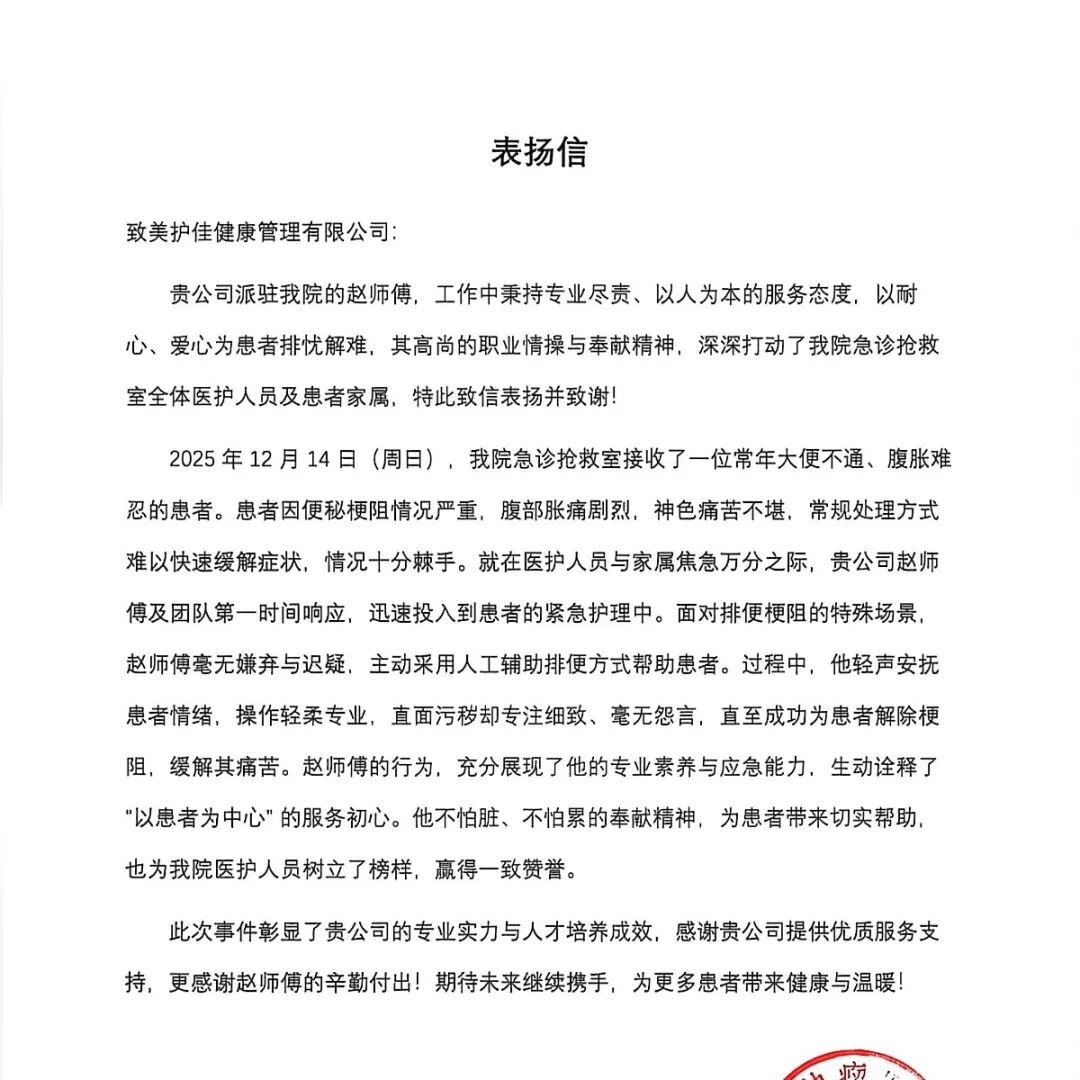 某医院急诊科:此次事件彰显了贵公司的专业实力与人才培养成效,感谢贵公司提供优质服务,更感谢赵师傅的辛勤付出,期待未来继续携手,为更多患者带来健康与温暖!