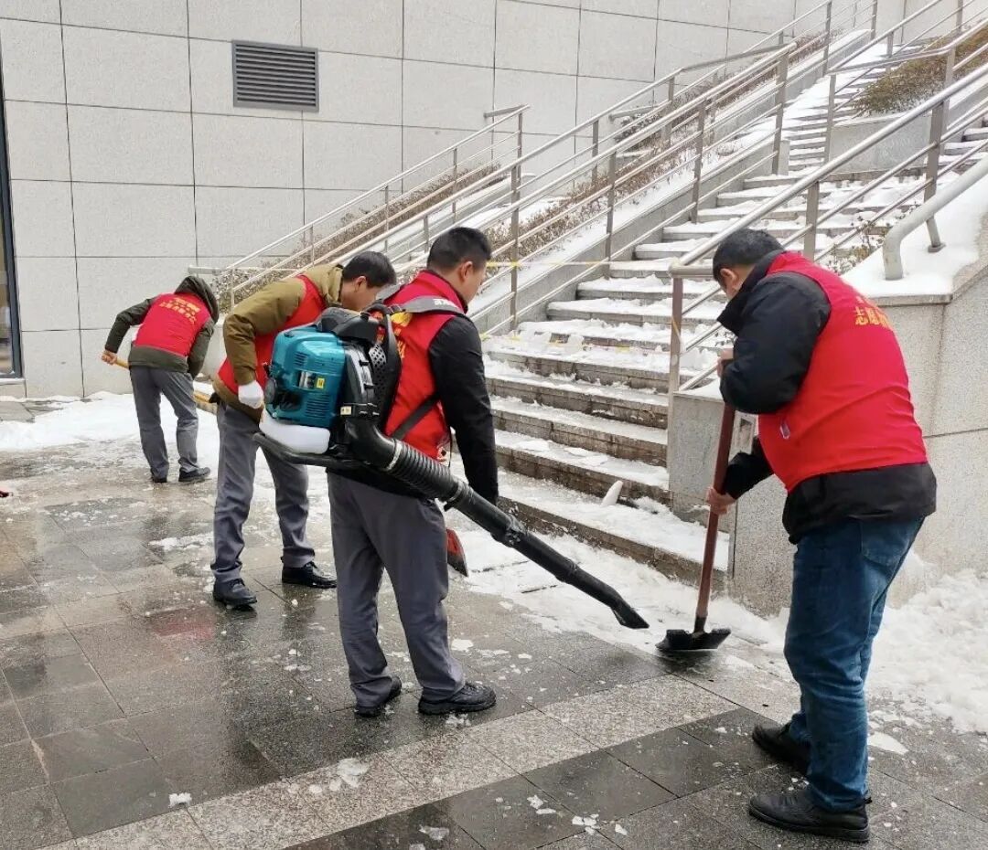 在全力保障各项目内部道路畅通的同时,美而特人的扫雪身影也活跃在更广阔的公共空间。公司旗下的“红丝绸美而特志愿队”“星和保安义警队”等积极响应号召,主动走上城市主干道及周边公共区域,挥舞铁锹和扫帚,协助清理积雪积冰。