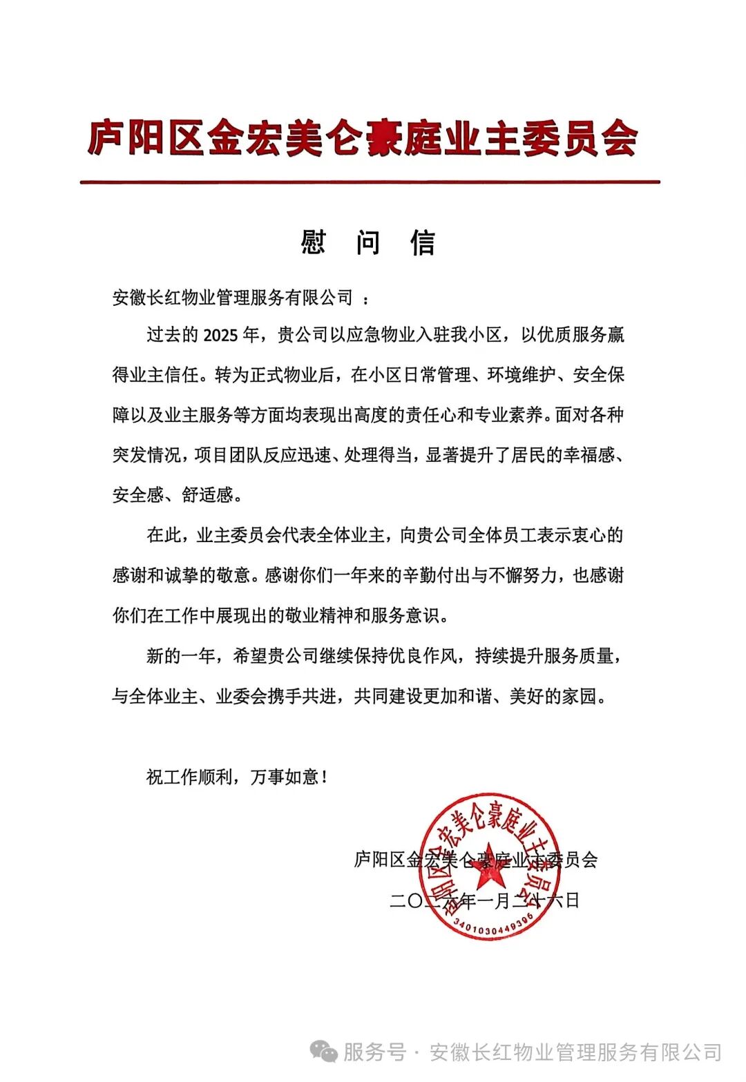 长红物业:一纸慰问暖人心 初心如磐护家园 金宏美仑豪庭项目获业委会深情致谢