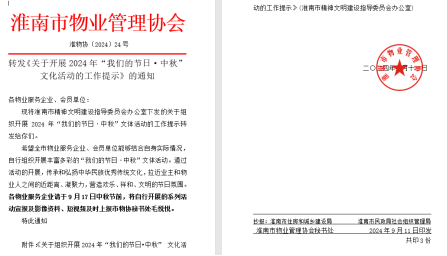 中秋佳节, 在这美好的日子里,淮南市物业管理协会积极响应上级文件精神,专门下文号召各会员单位在其所服务的项目中结合实际情况,精心组织并开展丰富多彩的“我们的节日·中秋节”文化活动。