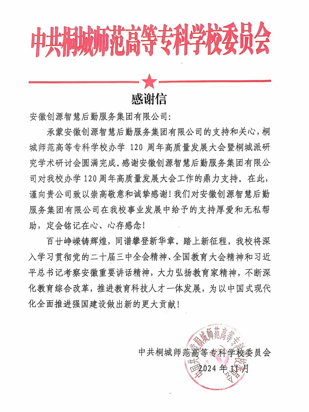 前不久,桐城师范高等专科学校办学120周年高质量发展大会暨桐城派研究学术研讨会盛大举行。为保障好这场具有历史意义的盛会,公司驻该校服务团队不辞辛劳、热情参与,始终以专业的服务和高效的执行力投身其中,为大会的顺利进行提供有力保障,赢得了广泛赞誉。感谢信最后写道:“对公司在我校事业发展中给予的支持厚爱和无私帮助,定会铭记在心、心存感念!”金奖银奖,不如业主夸奖!在荣誉的殿堂里,奖杯和证书或许能够见证公司的成就,但来自业主的真情夸奖,才是最宝贵的财富。这些夸奖不仅是对我们过去努力的认可,更是对未来工作的鞭策和激励。全体创源人将继续坚持“以客户为中心”,聚焦现实需求做工作,不断提升服务质量,用实际行动回应业主的信任和期待。