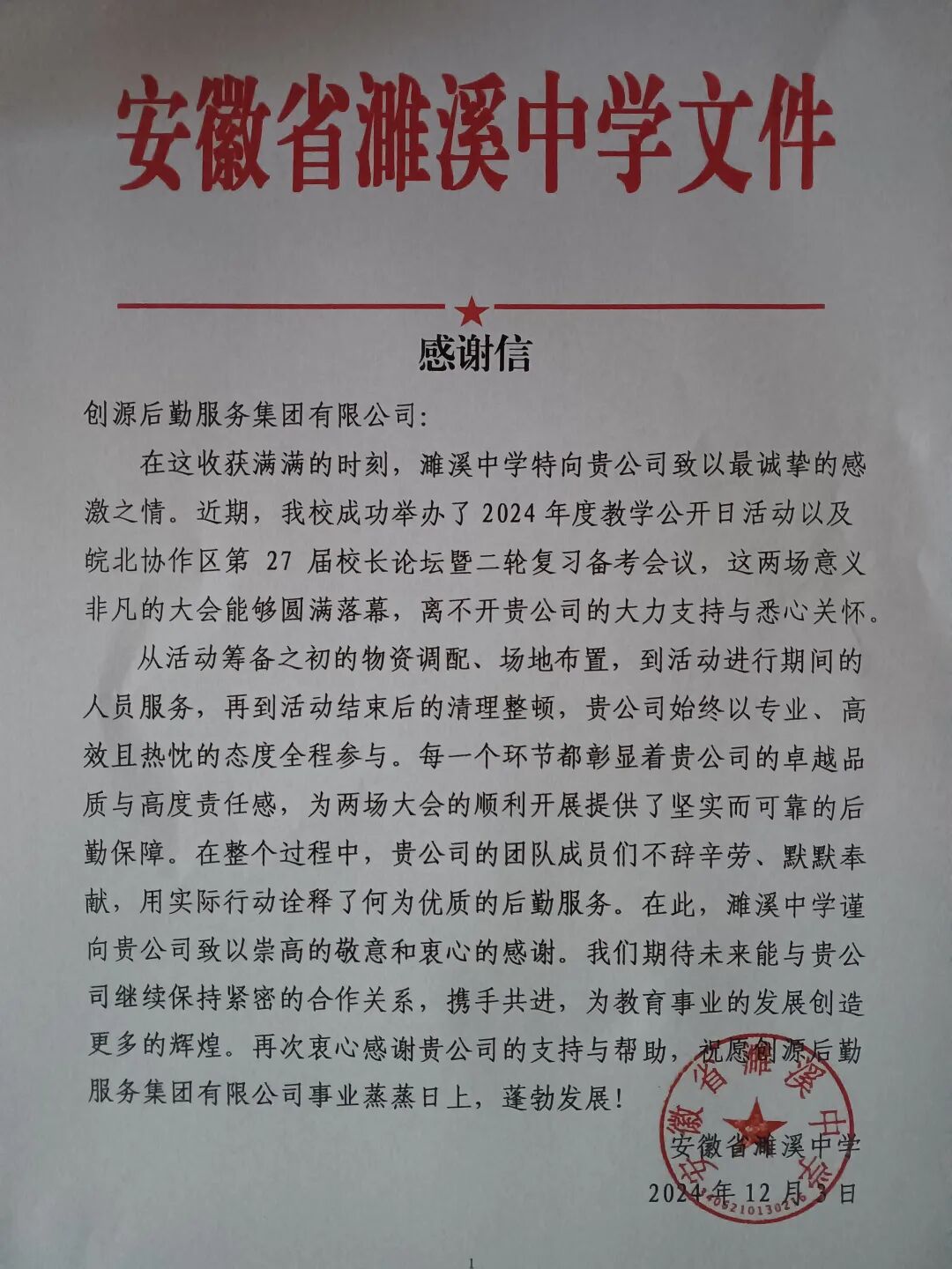 日前,从濉溪中学发来的感谢信也让人倍感荣幸。感谢信指出,学校成功举办了2024年度教学公开日活动以及皖北协作区第27届校长论坛暨二轮复习备考会议,这两场活动的圆满落幕,离不开高效、贴心的物业服务保障。感谢信强调,从活动筹备之初的物资调配、场地布置,到活动进行期间的人员服务,再到活动结束后的清理整顿,公司服务团队始终以专业、高效且热忱的态度全程参与,为活动的顺利进行提供了坚实的后盾。感谢信说:“在整个过程中,贵公司的团队成员们用实际行动诠释了何为优质的后勤服务”。在众多的感谢信、表扬信中,以中共桐城师范高等专科学校委员会名义发来的感谢信,格外引人瞩目,这是为数不多的以党组织名义发来的感谢信。